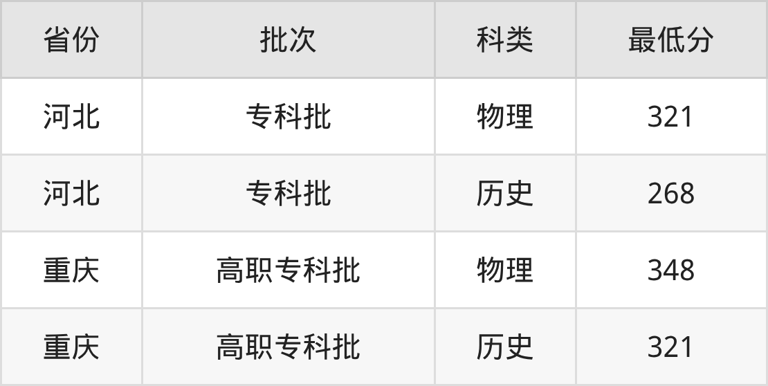 重庆公共运输职业学院跨境电子商务专业录取分数线从268分到348分不等,最低分数线如下: