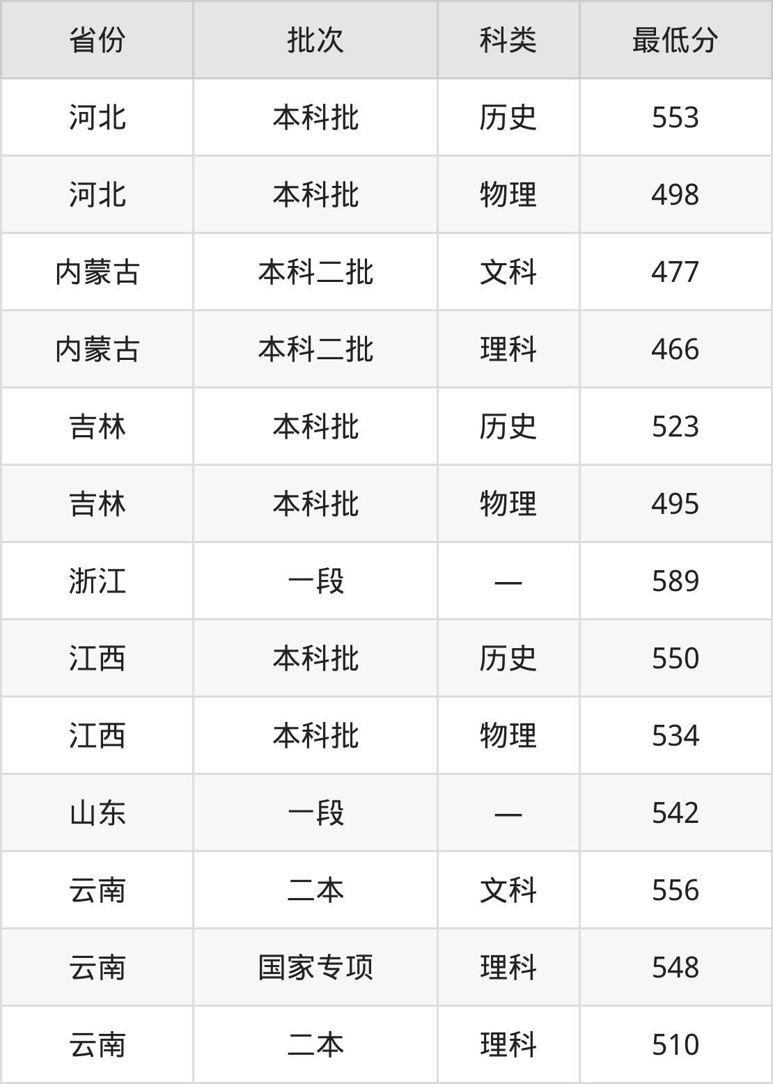 中国劳动关系学院行政管理专业在全国各省最低录取分数线为466分(内蒙古理科),除此之外,在其余地区的最低分为云南理科510分、河北物理类498分、吉林物理类495分、浙江589分等,以上数据均为2024年数据,供2025年高考生参考。