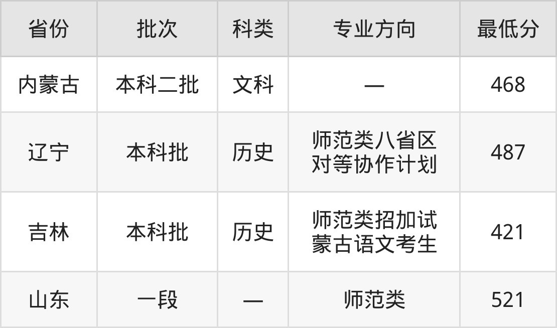 呼和浩特民族学院汉语言文学专业在全国各省录取分数线: