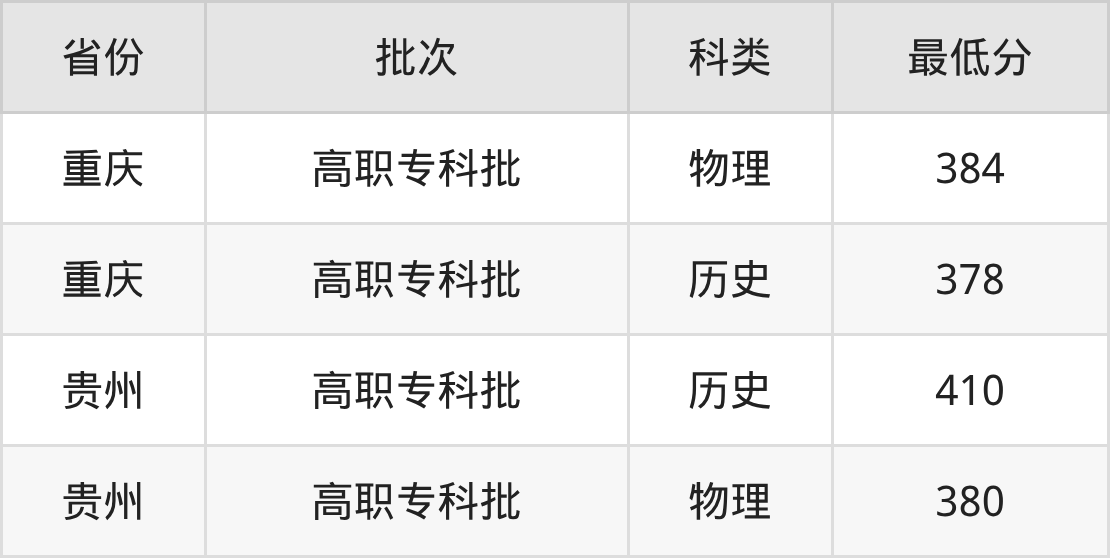 重庆安全技术职业学院工业机器人技术专业录取分数线从378分到410分不等,最低分数线如下: