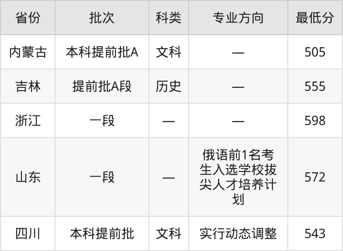 黑龙江大学俄语专业录取分数线从505分到598分不等,最低分数线如下:
