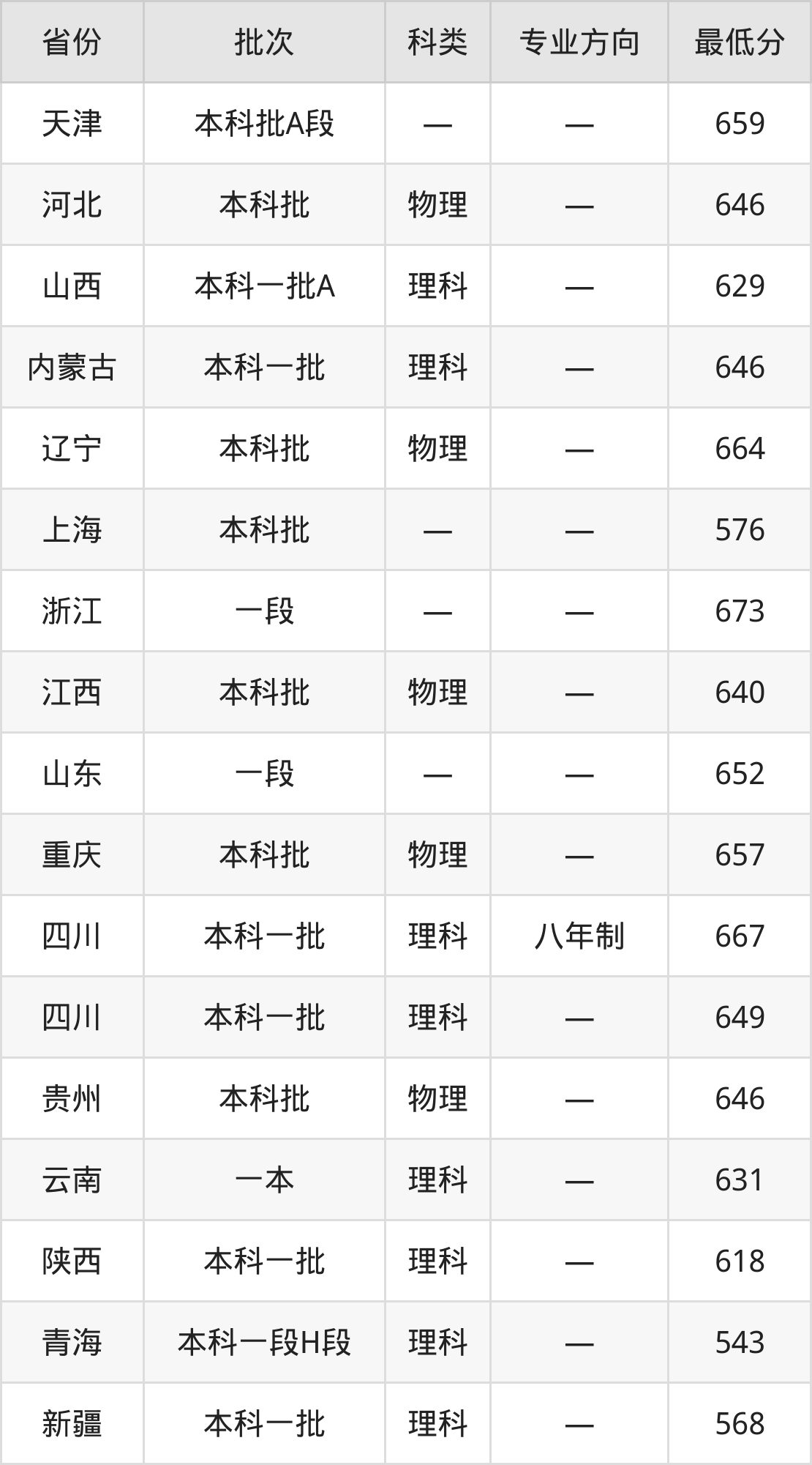 四川大学临床医学专业录取分数线从543分到687分不等,在部分地区的最低分数线如下: