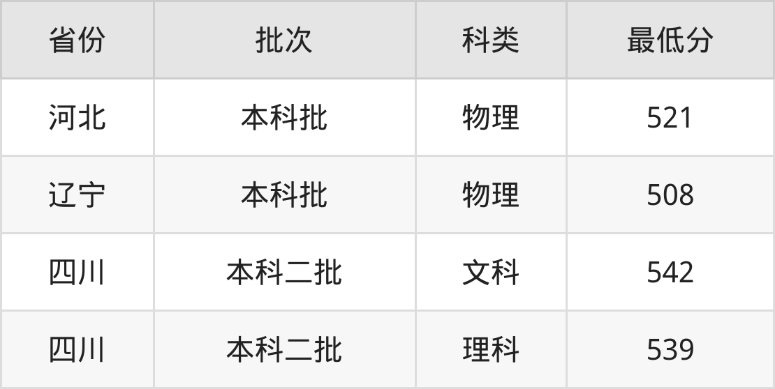 河北中医药大学康复治疗学专业在全国各省最低录取分数线为508分(辽宁物理类),除此之外,在其余地区的最低分为河北物理类521分、四川理科539分,以上数据均为2024年数据,供2025年高考生参考。