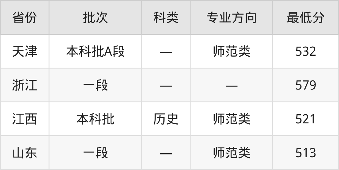 玉林师范学院汉语言文学专业在全国各省最低录取分数线为513分(山东),除此之外,在其余地区的最低分为天津532分、浙江579分、江西历史类521分,以上数据均为2024年数据,供2025年高考生参考。