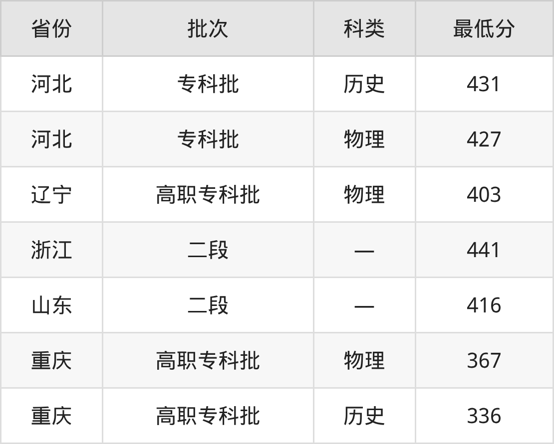 江西水利职业学院水利水电建筑工程专业在全国各省最低录取分数线为336分(重庆历史类),除此之外,在其余地区的最低分为河北物理类427分、辽宁物理类403分、浙江441分、山东416分,以上数据均为2025年数据,供2026年高考生参考。