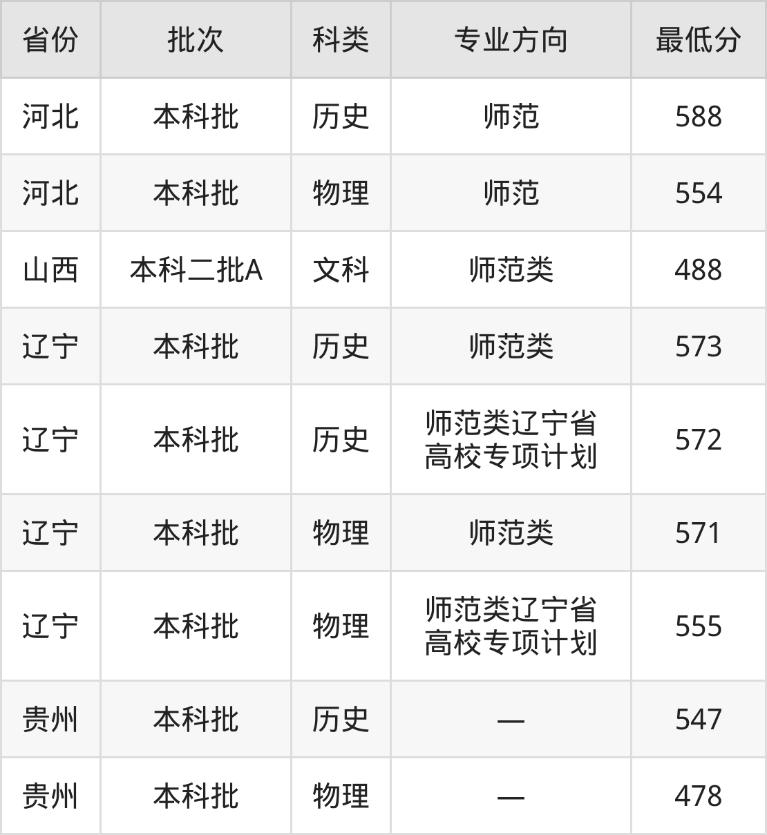 辽宁师范大学历史学专业在全国各省最低录取分数线为478分(贵州物理类),除此之外,在其余地区的最低分为河北物理类554分、山西文科488分、辽宁物理类555分,以上数据均为2024年数据,供2025年高考生参考。