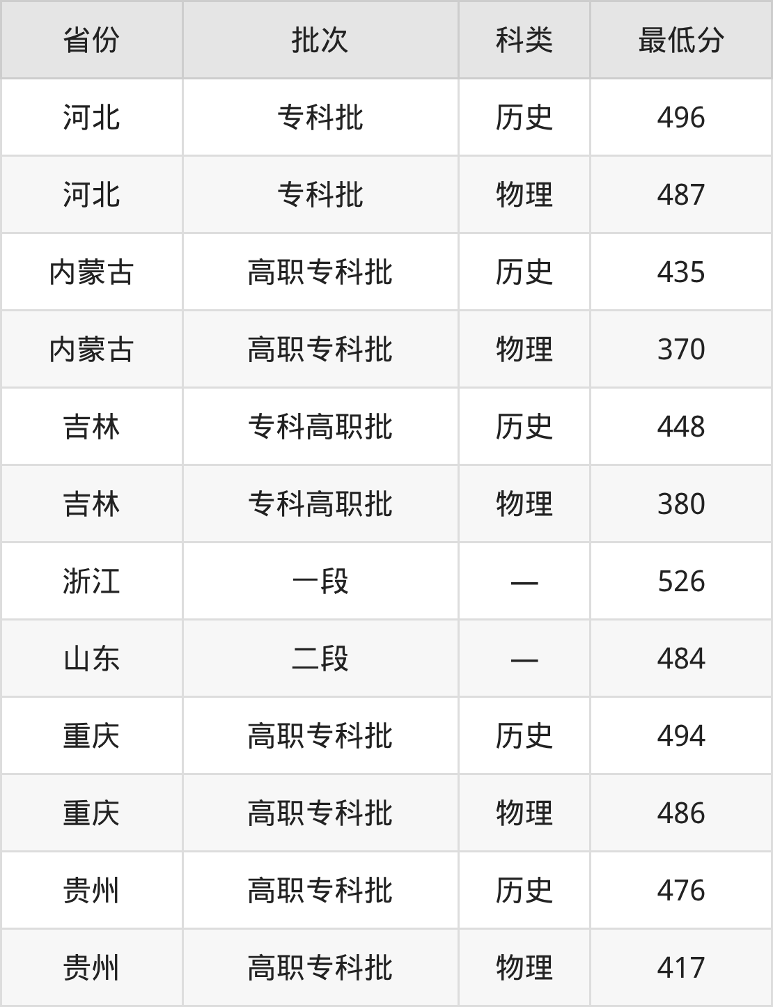 武汉铁路职业技术学院铁道工程技术专业录取分数线从370分到526分不等,最低分数线如下: