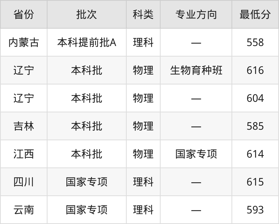 吉林大学动物科学专业录取分数线从558分到616分不等,最低分数线如下: