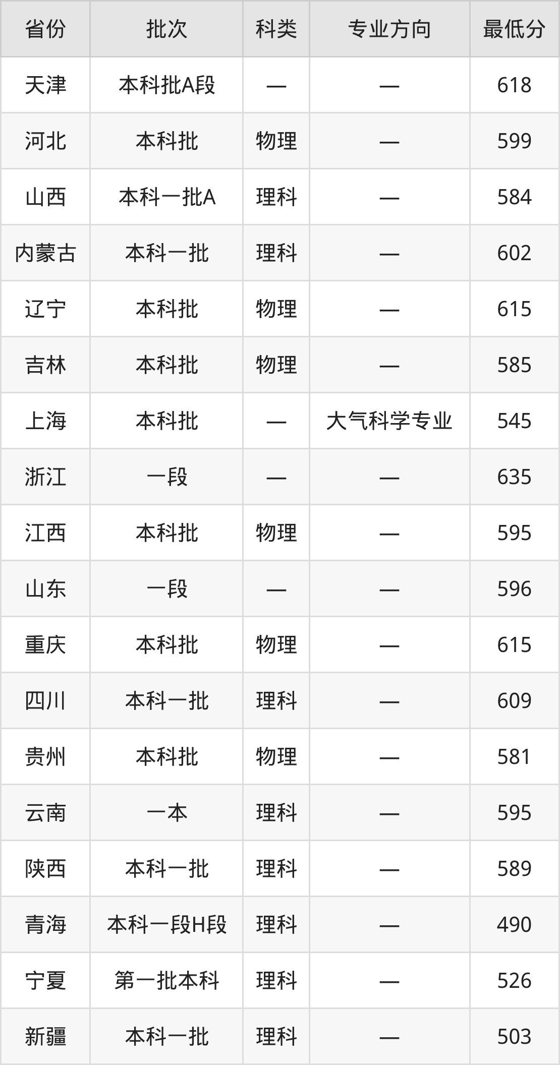 南京信息工程大学大气科学类专业在全国各省录取分数线: