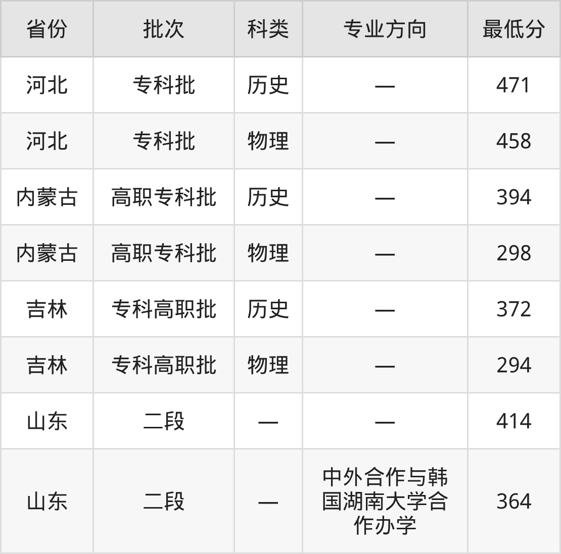 山东经贸职业学院大数据与会计专业在全国各省最低录取分数线为294分(吉林物理类),除此之外,在其余地区的最低分为河北物理类458分、内蒙古物理类298分、山东364分,以上数据均为2025年数据,供2026年高考生参考。