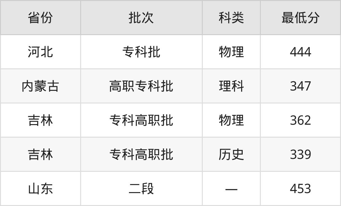 威海职业学院大数据与会计专业录取分数线从339分到453分不等,最低分数线如下:
