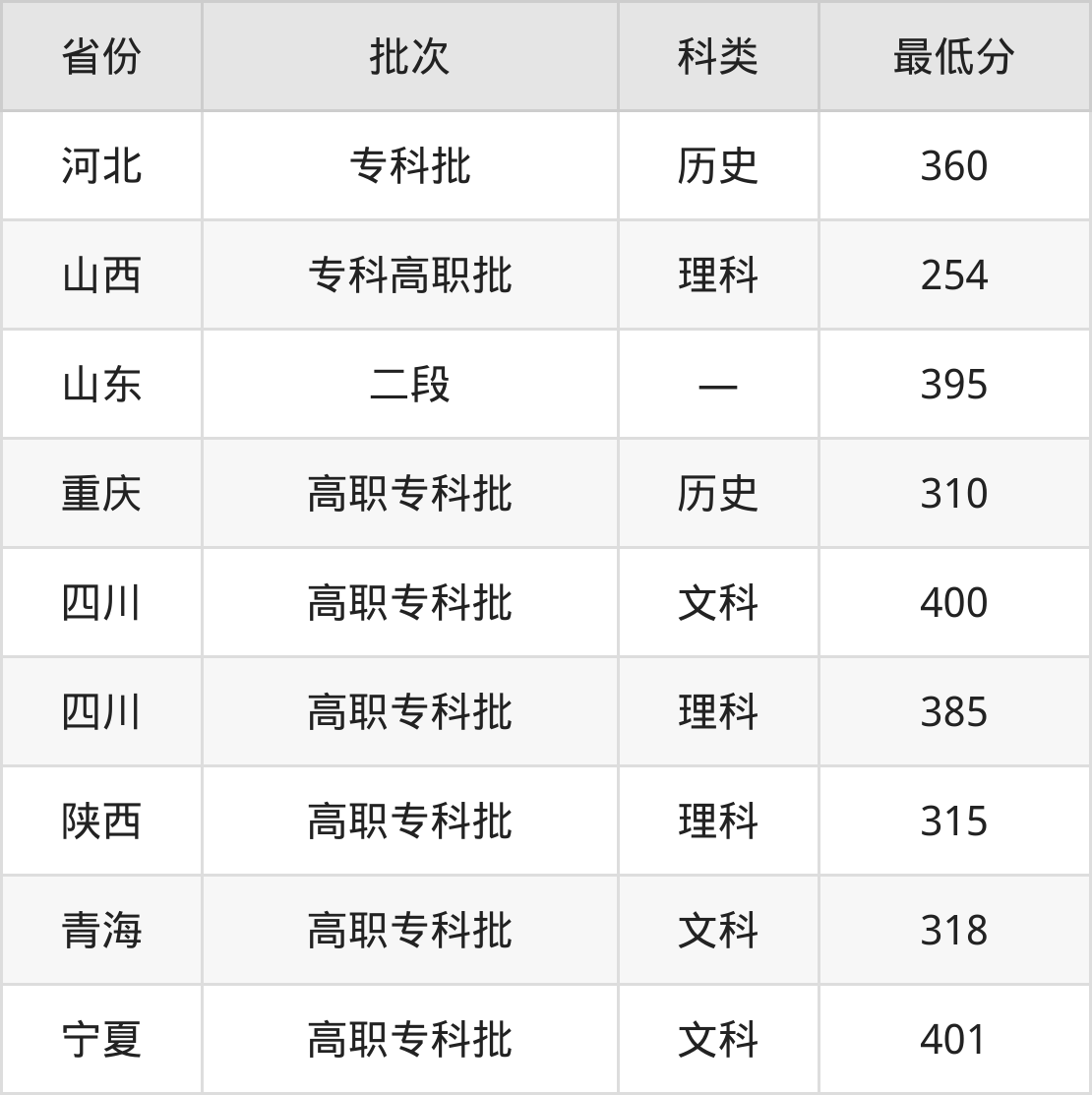 乌鲁木齐职业大学应用英语专业录取分数线从254分到401分不等,最低分数线如下:
