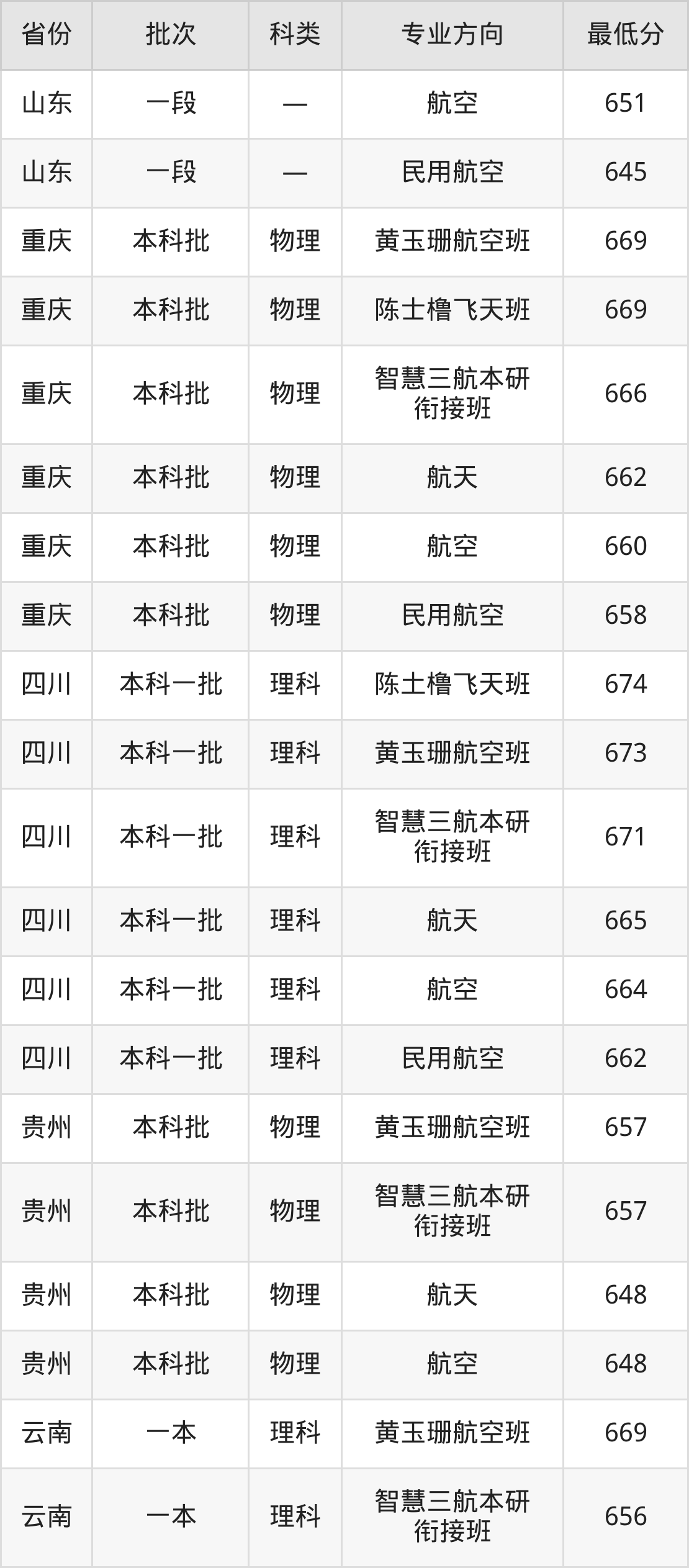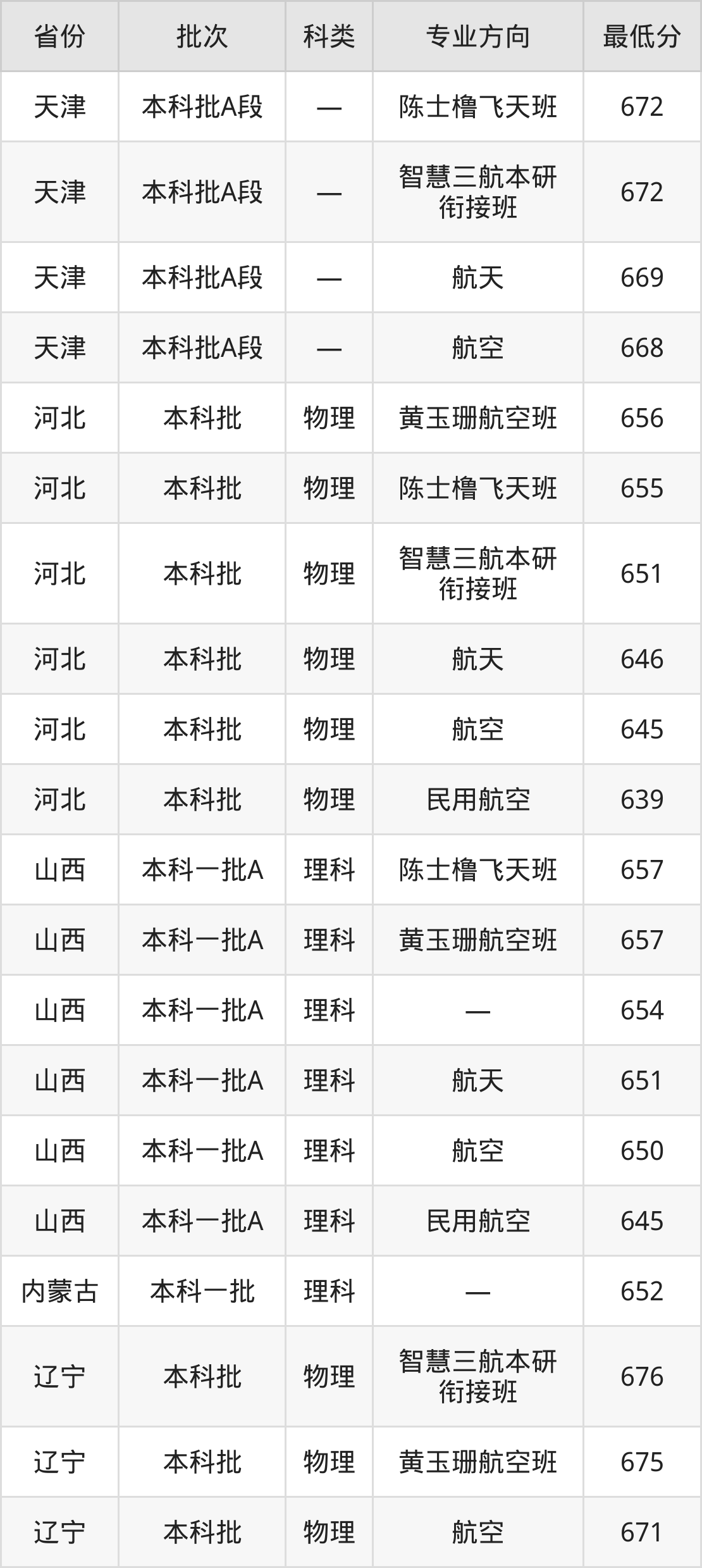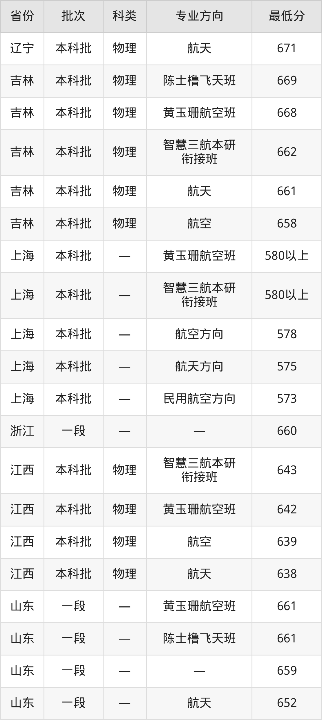 西北工业大学航空航天类专业录取分数线从573分到676分不等,在部分地区的最低分数线如下:
