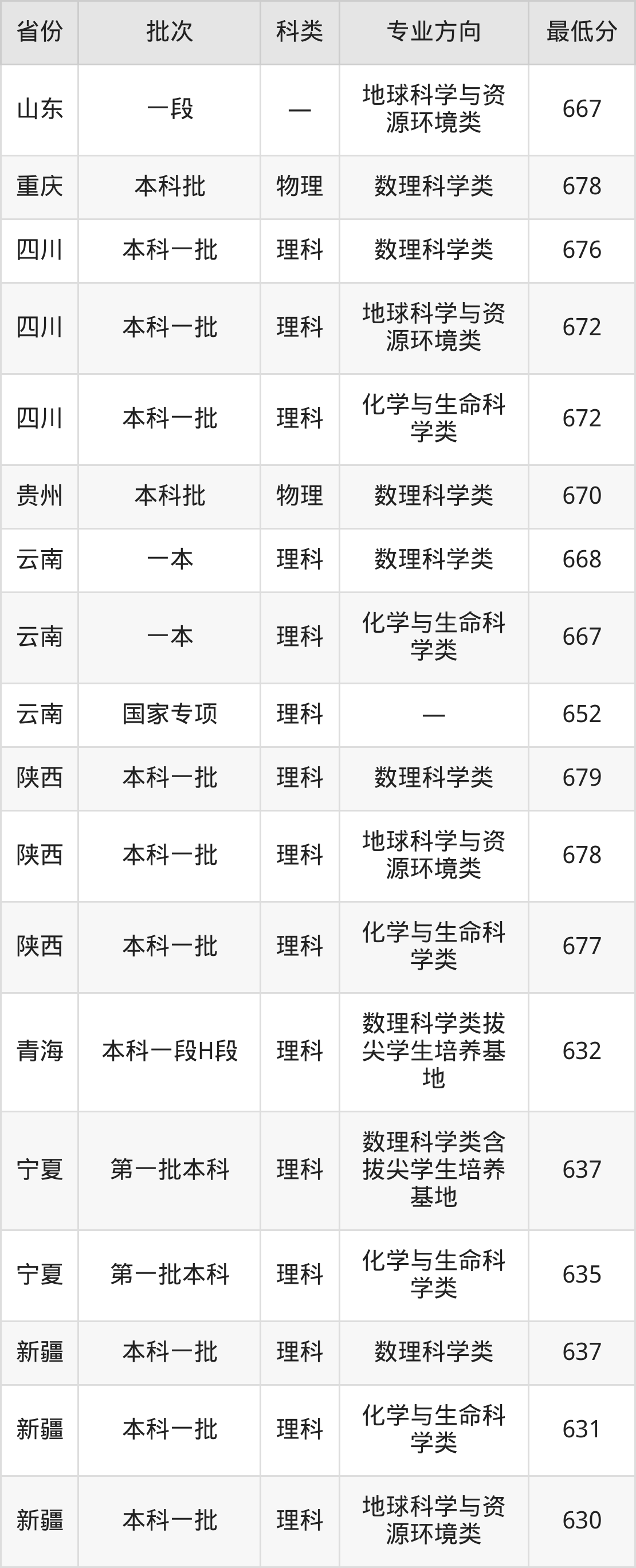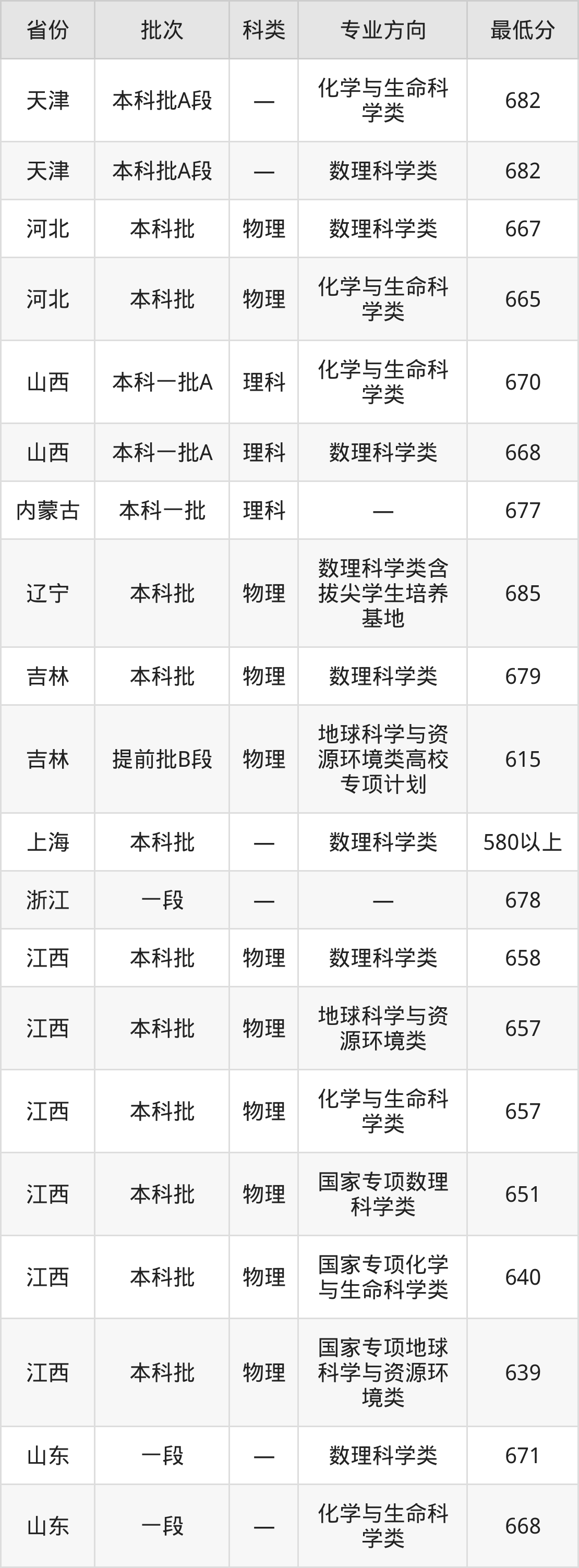南京大学理科试验班类专业录取分数线从580分到685分不等,在部分地区的最低分数线如下: