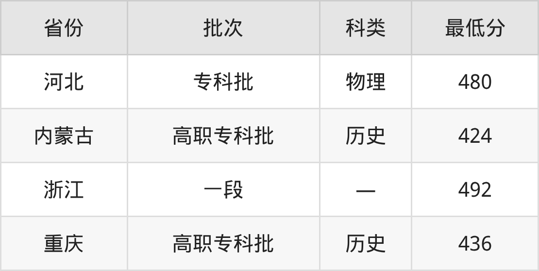 哈尔滨铁道职业技术学院铁道机车运用与维护专业在全国各省最低录取分数线为424分(内蒙古历史类),除此之外,在其余地区的最低分为河北物理类480分、浙江492分、重庆历史类436分,以上数据均为2025年数据,供2026年高考生参考。