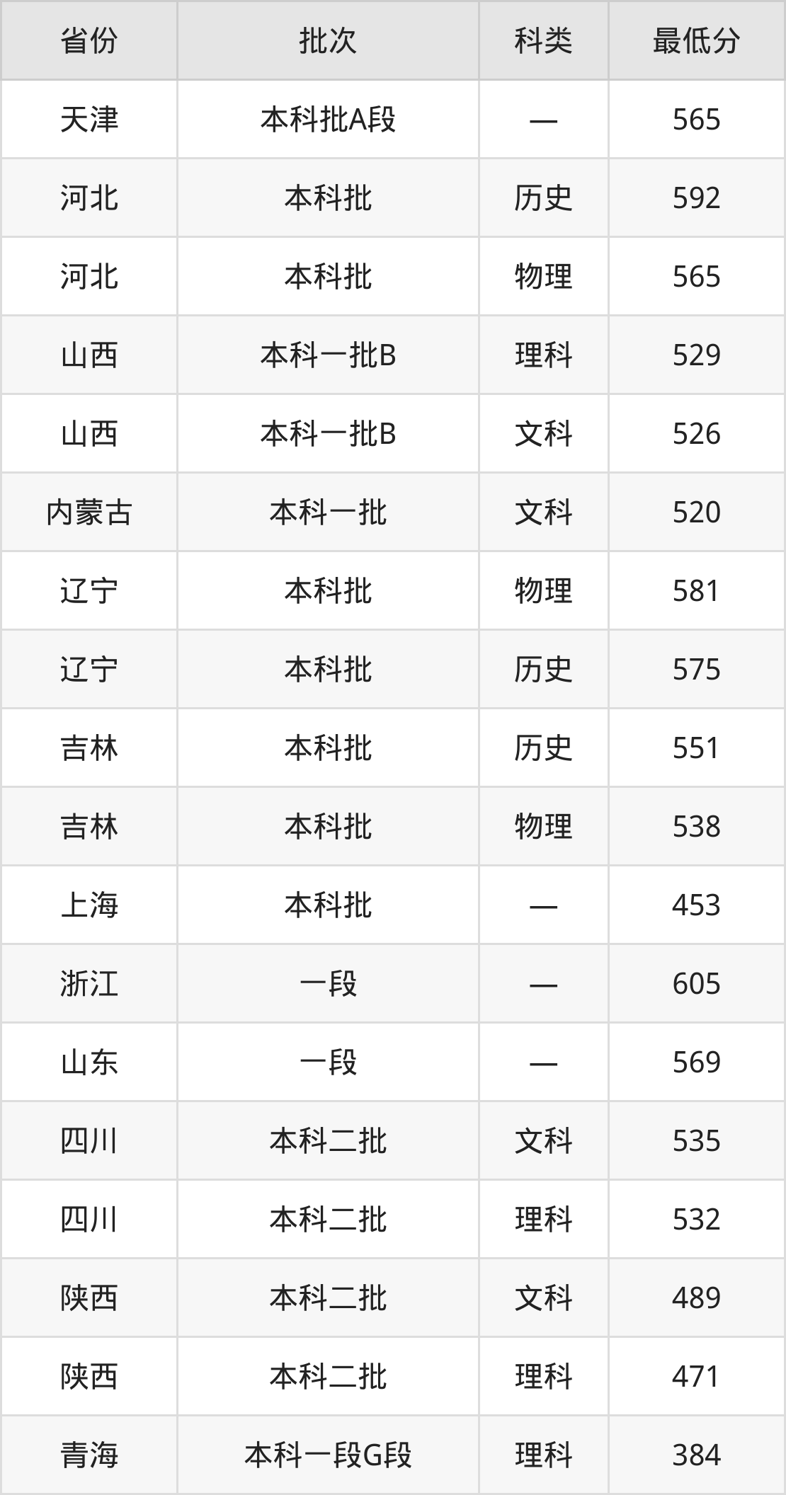 吉林财经大学法学专业录取分数线从384分到605分不等,在部分地区的最低分数线如下: