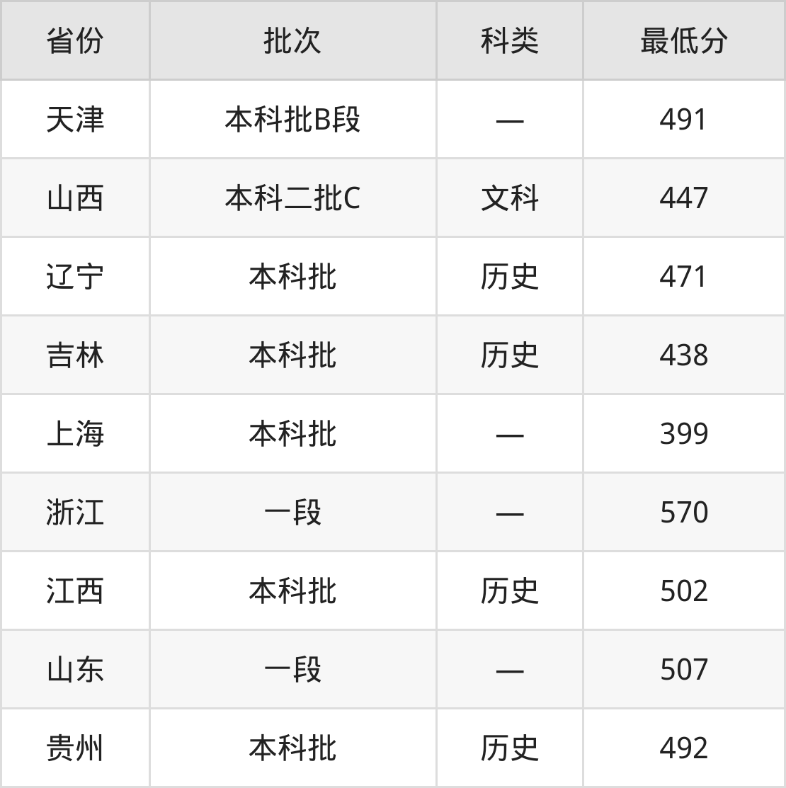 南昌大学科学技术学院汉语言文学专业在全国各省最低录取分数线为399分(上海),除此之外,在其余地区的最低分为山西文科447分、吉林历史类438分、贵州历史类492分、天津491分等,以上数据均为2024年数据,供2025年高考生参考。
