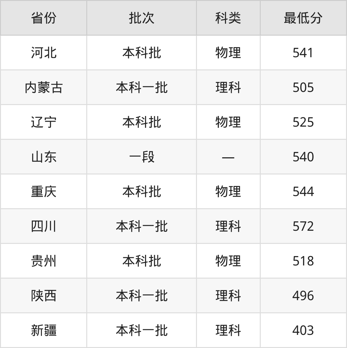 石河子大学动物科学专业在全国各省最低录取分数线为403分(新疆理科),除此之外,在其余地区的最低分为山东540分、四川理科572分、贵州物理类518分、陕西理科496分等,以上数据均为2024年数据,供2025年高考生参考。
