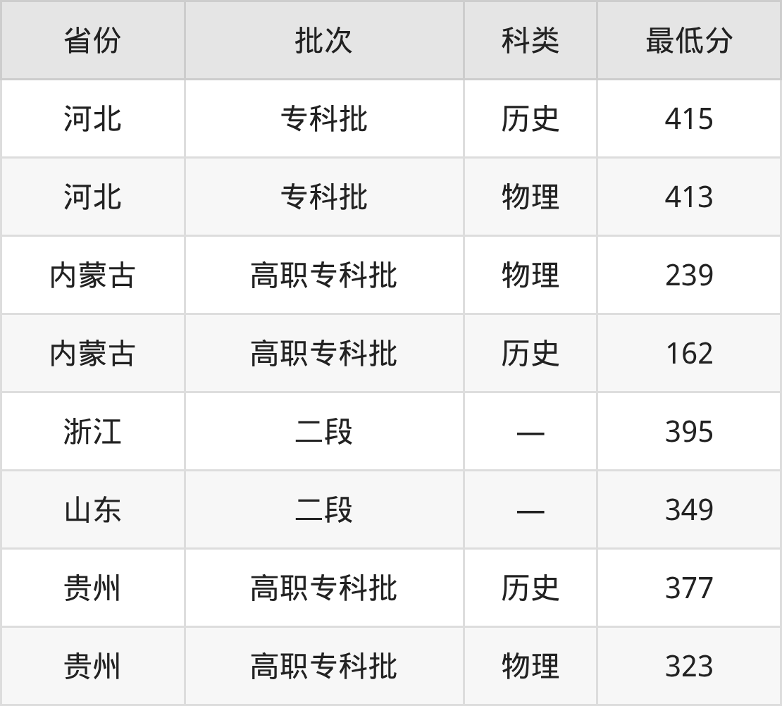 西安交通工程学院大数据与会计专业在全国各省最低录取分数线为162分(内蒙古历史类),除此之外,在其余地区的最低分为河北物理类413分、浙江395分、山东349分、贵州物理类323分,以上数据均为2025年数据,供2026年高考生参考。
