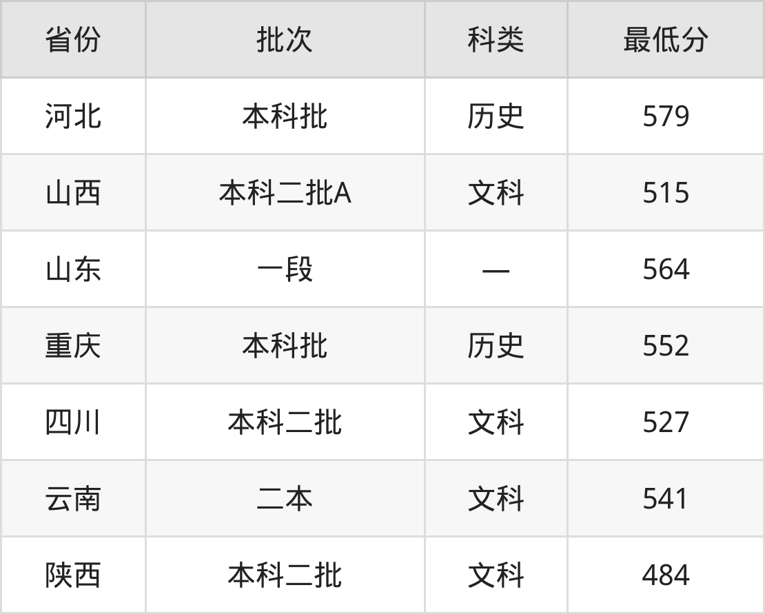 山东农业大学法学专业在全国各省最低录取分数线为484分(陕西文科),除此之外,在其余地区的最低分为四川文科527分、云南文科541分、河北历史类579分、山西文科515分等,以上数据均为2024年数据,供2025年高考生参考。