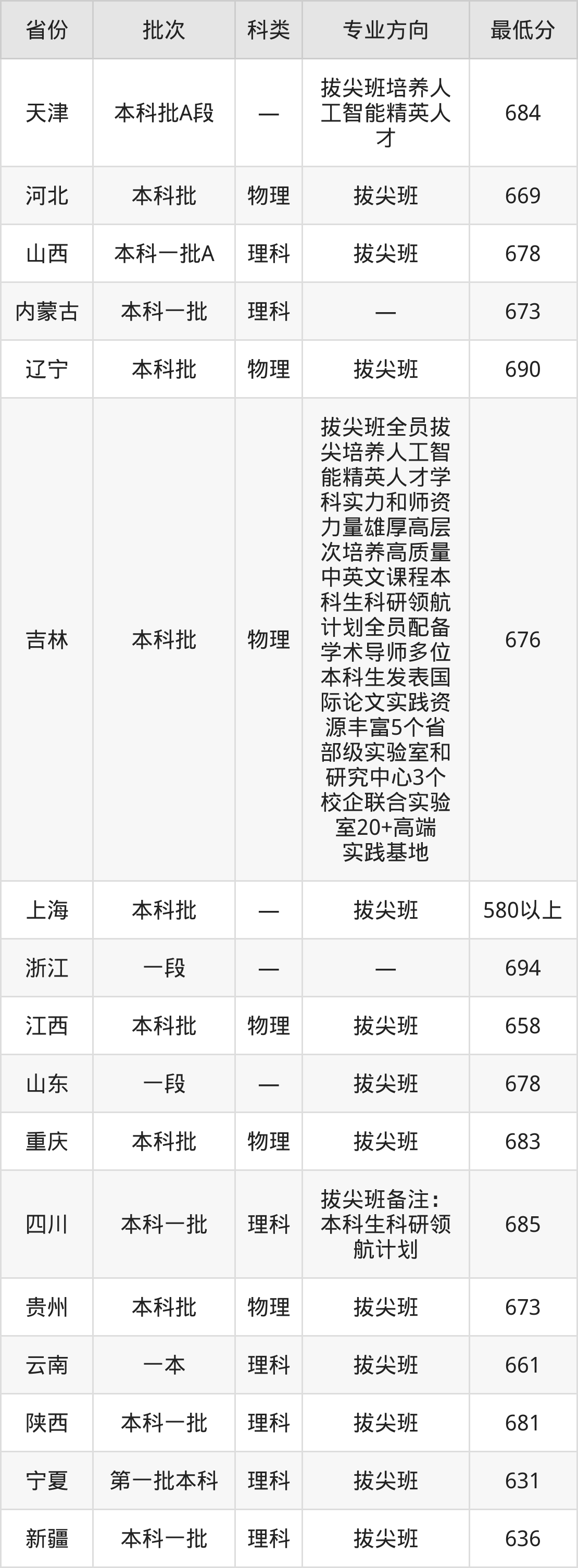 中国人民大学人工智能专业录取分数线从580分到694分不等,在部分地区的最低分数线如下: