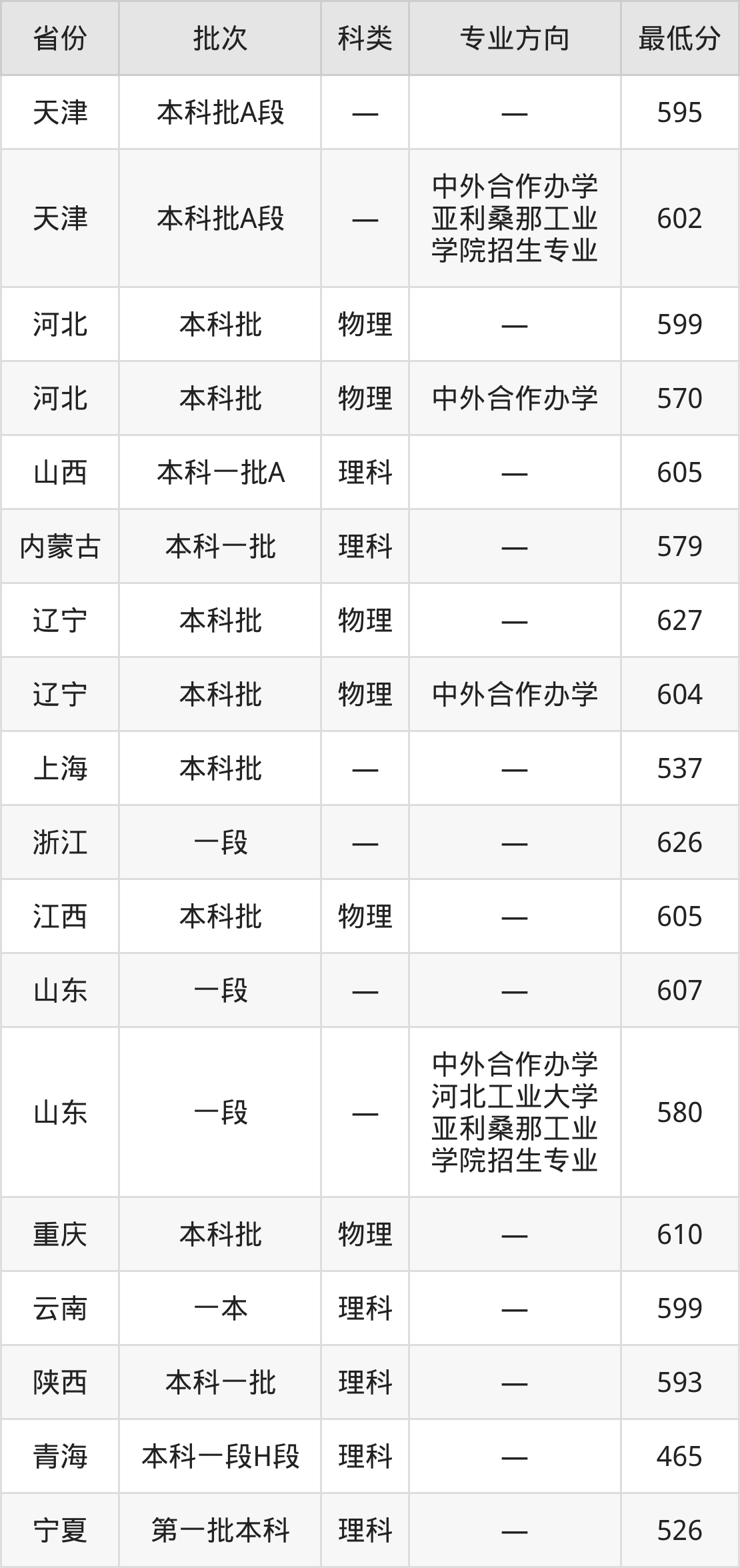 河北工业大学机械设计制造及其自动化专业录取分数线从465分到627分不等,在部分地区的最低分数线如下: