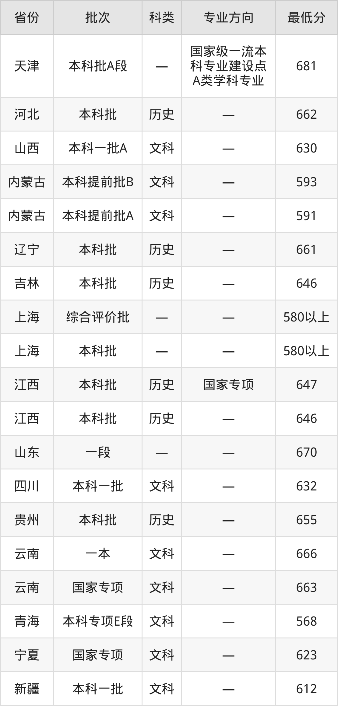 复旦大学社会科学试验班专业录取分数线从568分到681分不等,在部分地区的最低分数线如下:
