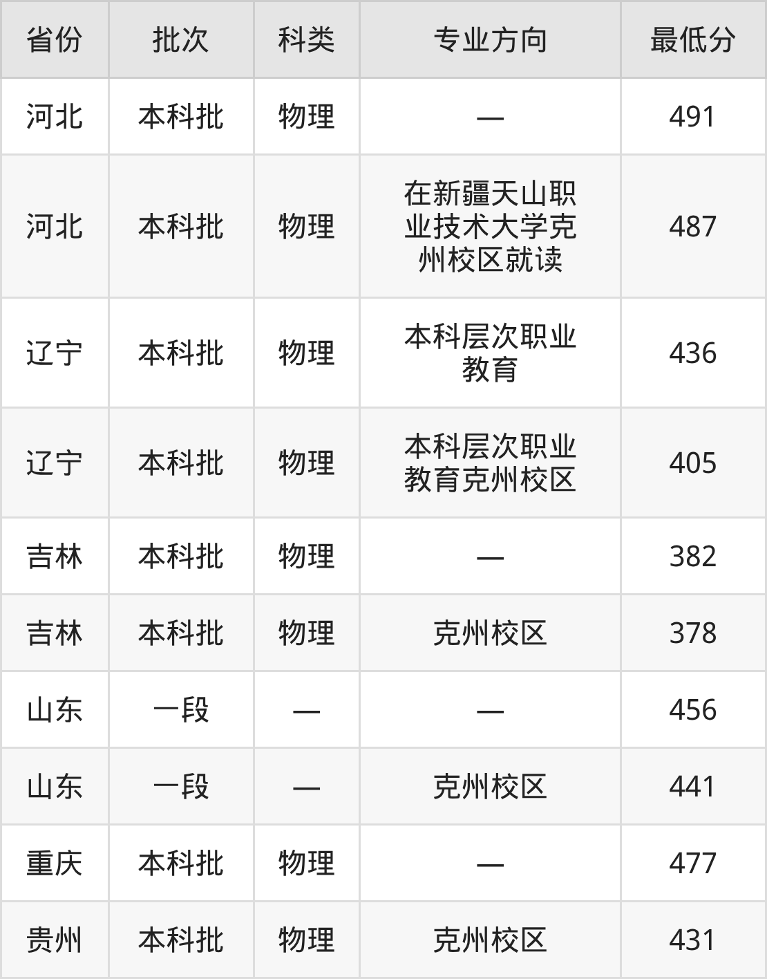 新疆天山职业技术大学智能制造工程技术专业录取分数线从378分到491分不等,最低分数线如下: