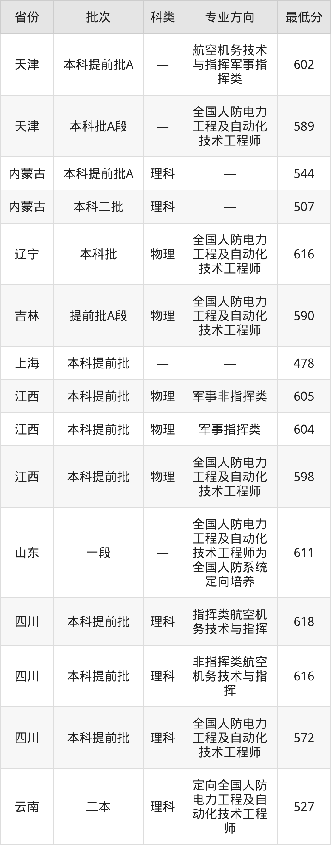 陆军工程大学电气工程及其自动化专业在全国各省录取分数线: