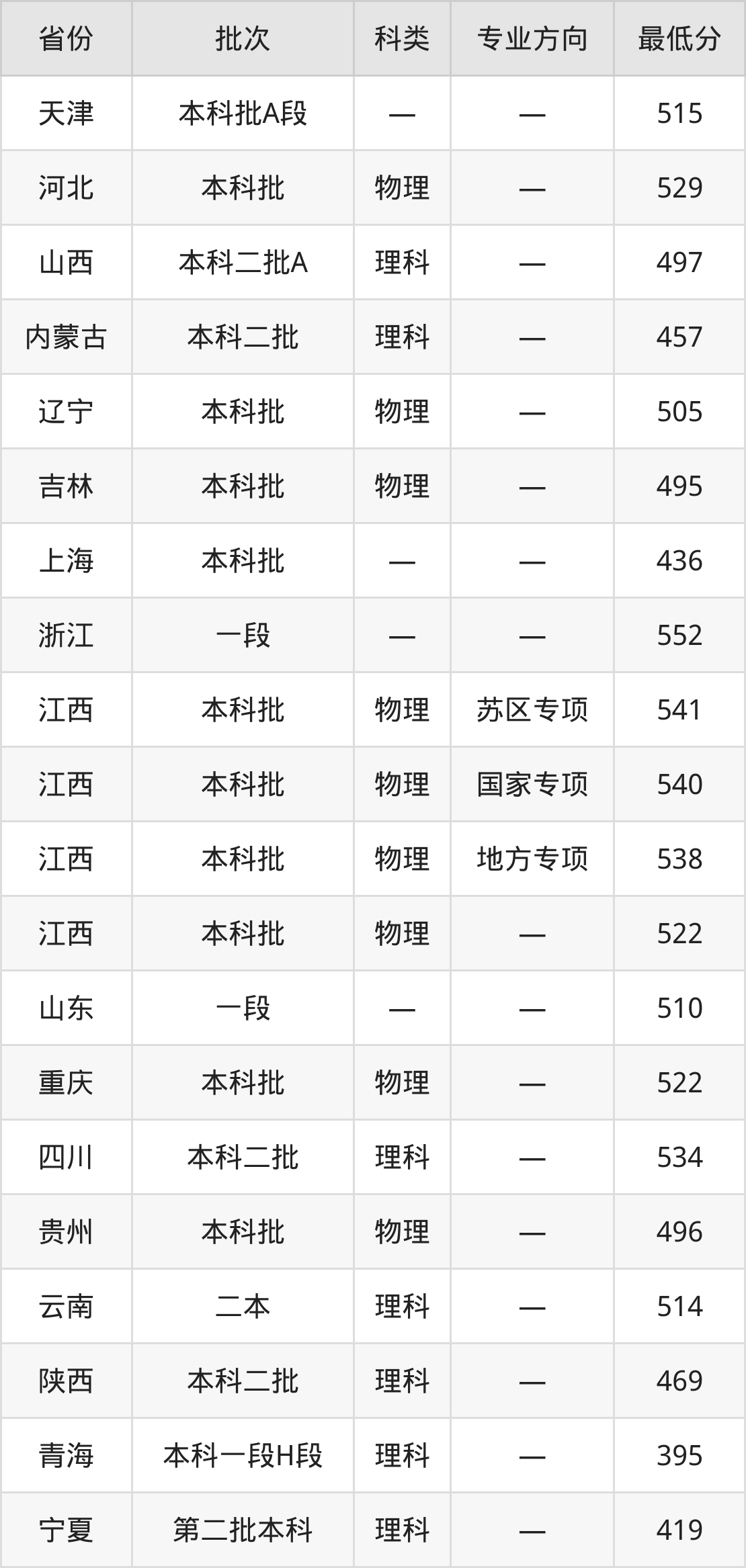 南昌工程学院水利水电工程专业录取分数线从395分到552分不等,在部分地区的最低分数线如下: