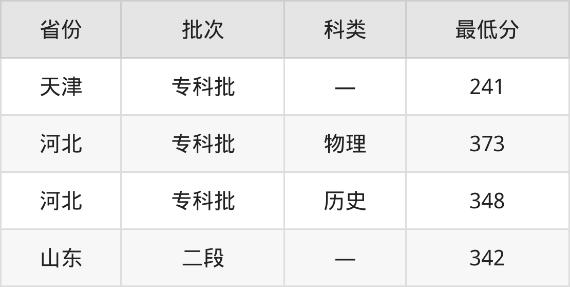 燕京理工学院医学检验技术专业在全国各省最低录取分数线为241分(天津),除此之外,在其余地区的最低分为河北历史类348分、山东342分,以上数据均为2024年数据,供2025年高考生参考。