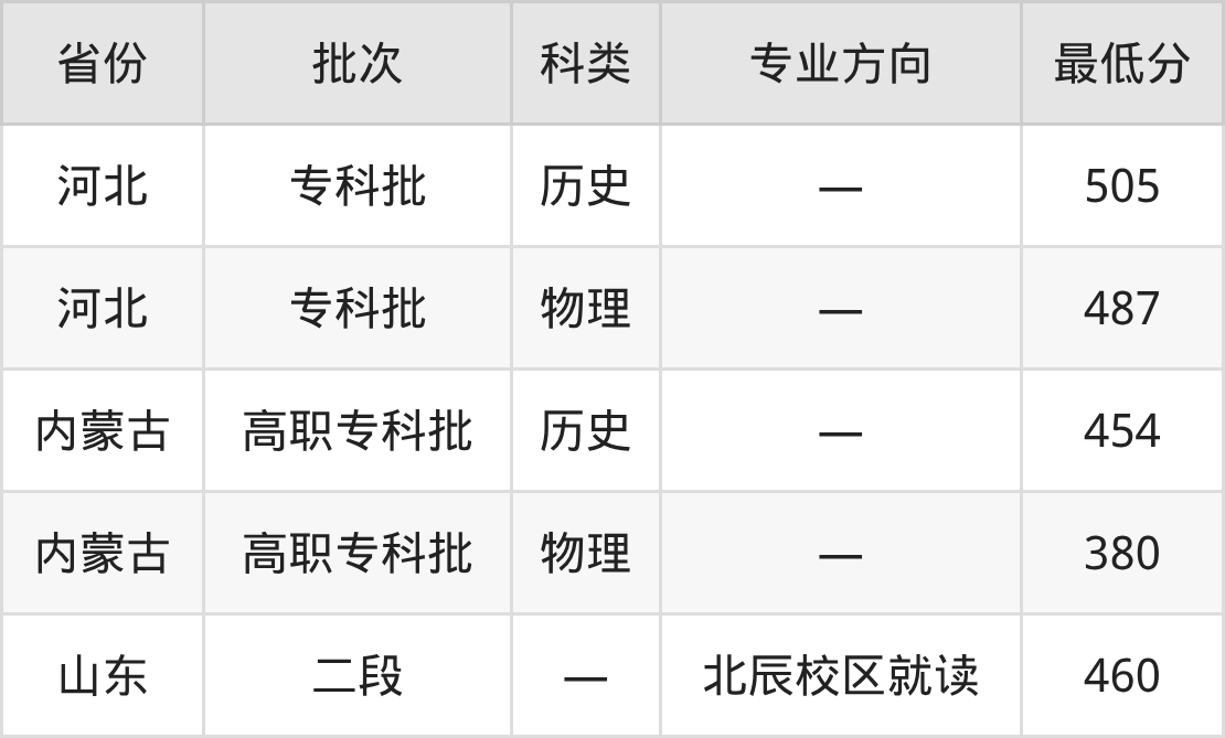 天津市职业大学国际商务专业在全国各省最低录取分数线为380分(内蒙古物理类),除此之外,在其余地区的最低分为河北物理类487分、山东460分,以上数据均为2025年数据,供2026年高考生参考。