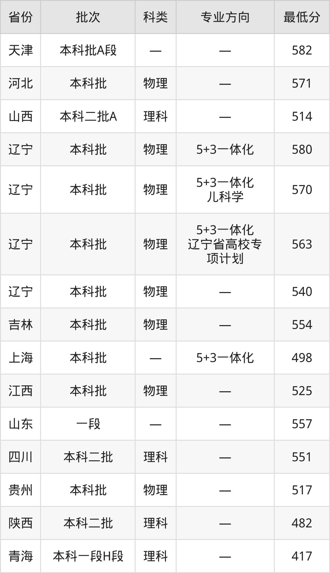 辽宁中医药大学中医学专业录取分数线从417分到582分不等,在部分地区的最低分数线如下: