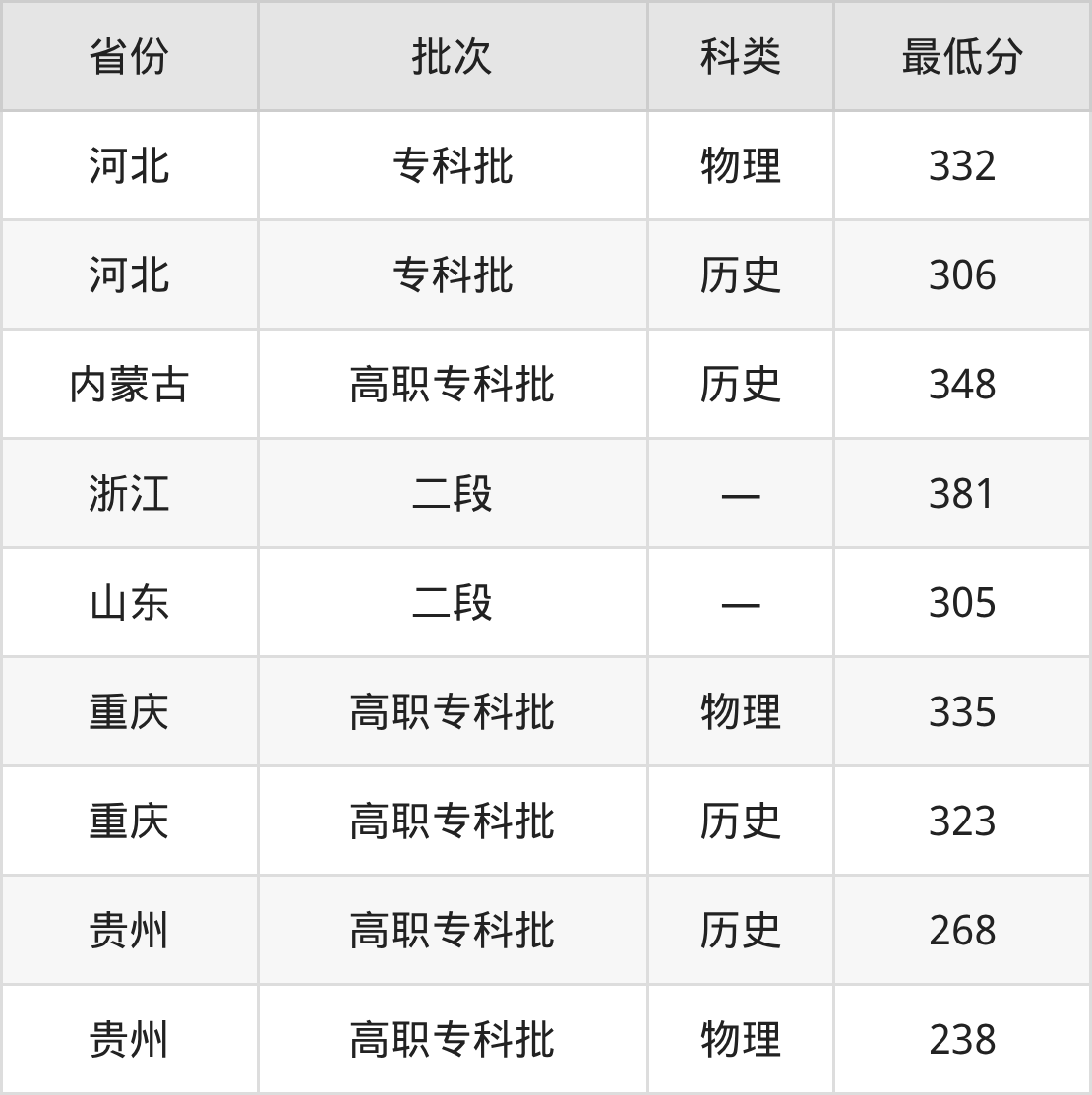 贵州工贸职业学院大数据与会计专业在全国各省最低录取分数线为238分(贵州物理类),除此之外,在其余地区的最低分为内蒙古历史类348分、浙江381分、山东305分、重庆历史类323分等,以上数据均为2025年数据,供2026年高考生参考。