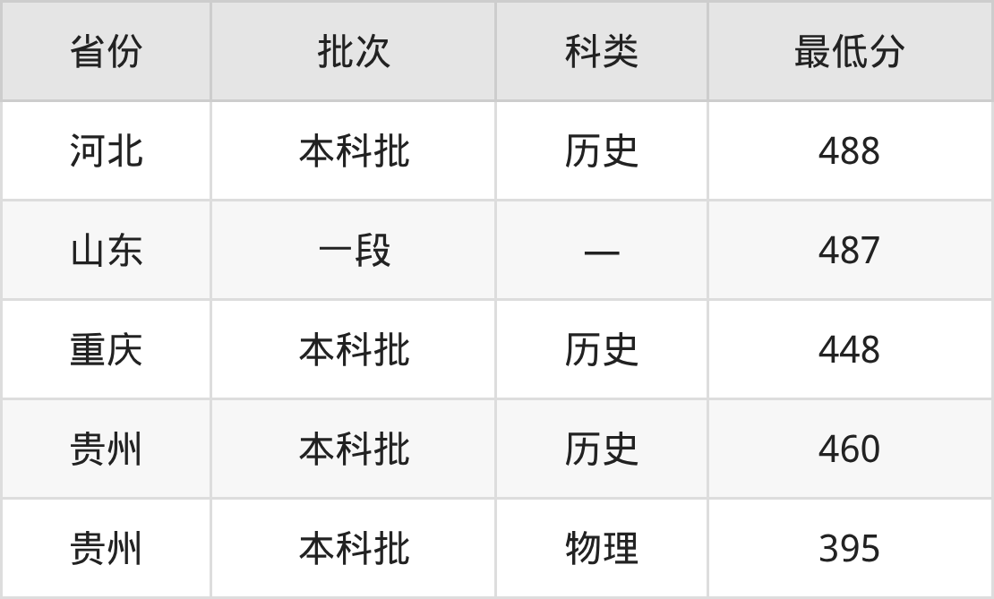 南通理工学院物流管理专业在全国各省最低录取分数线为395分(贵州物理类),除此之外,在其余地区的最低分为重庆历史类448分、河北历史类488分、山东487分,以上数据均为2025年数据,供2026年高考生参考。