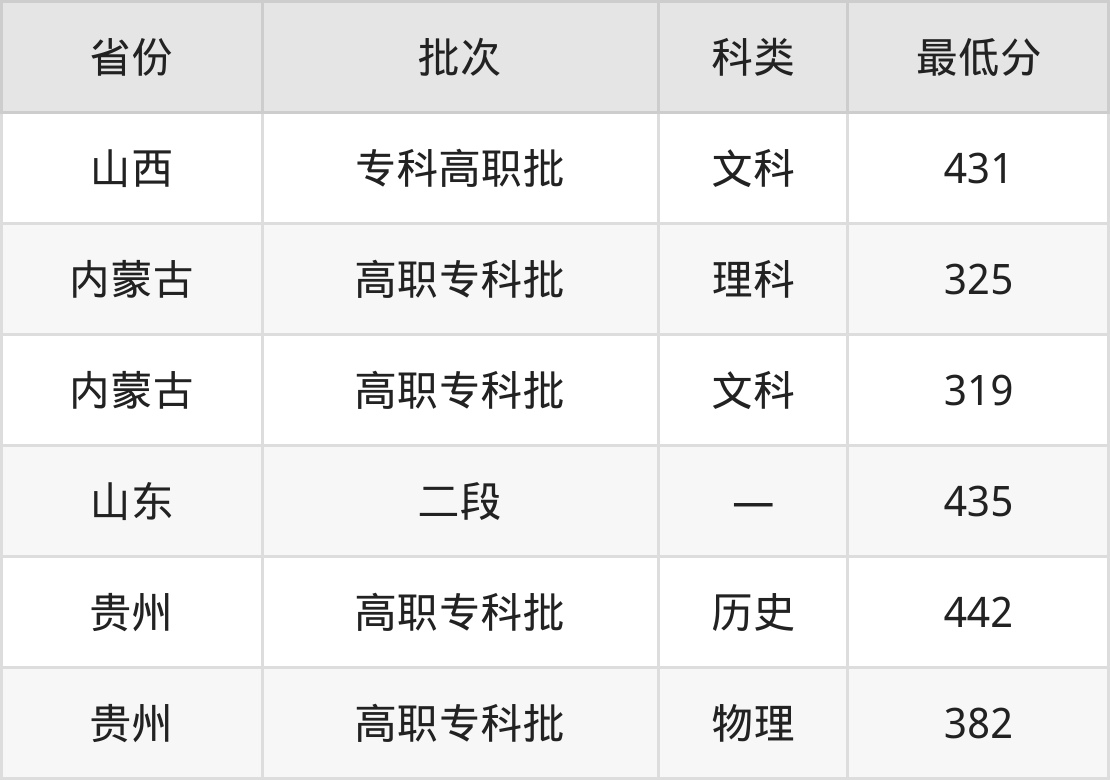 淄博职业技术大学物联网应用技术专业录取分数线从319分到442分不等,最低分数线如下: