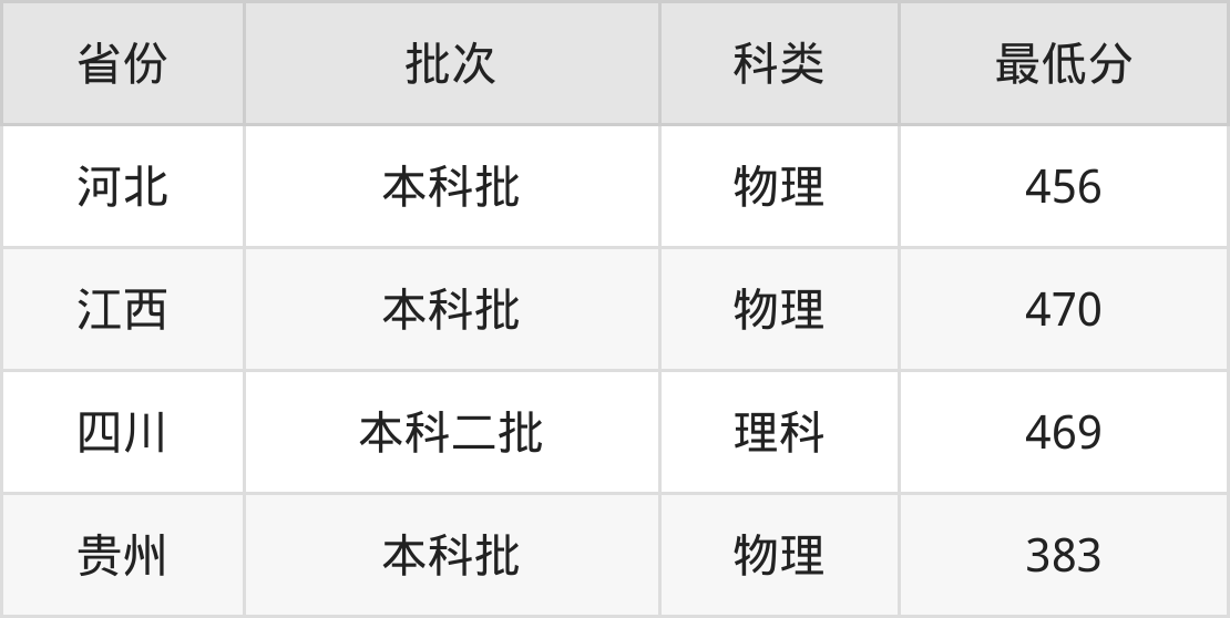 广东科技学院物联网工程专业在全国各省最低录取分数线为383分(贵州物理类),除此之外,在其余地区的最低分为河北物理类456分、江西物理类470分、四川理科469分,以上数据均为2024年数据,供2025年高考生参考。