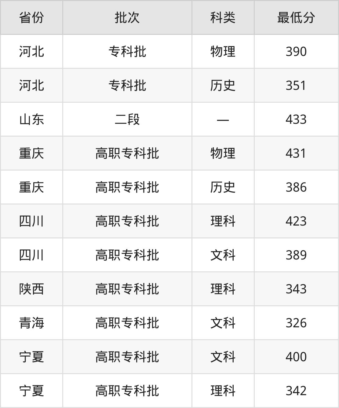 乌鲁木齐职业大学智慧健康养老服务与管理专业在全国各省最低录取分数线为326分(青海文科),除此之外,在其余地区的最低分为河北历史类351分、山东433分、重庆历史类386分、四川文科389分等,以上数据均为2024年数据,供2025年高考生参考。