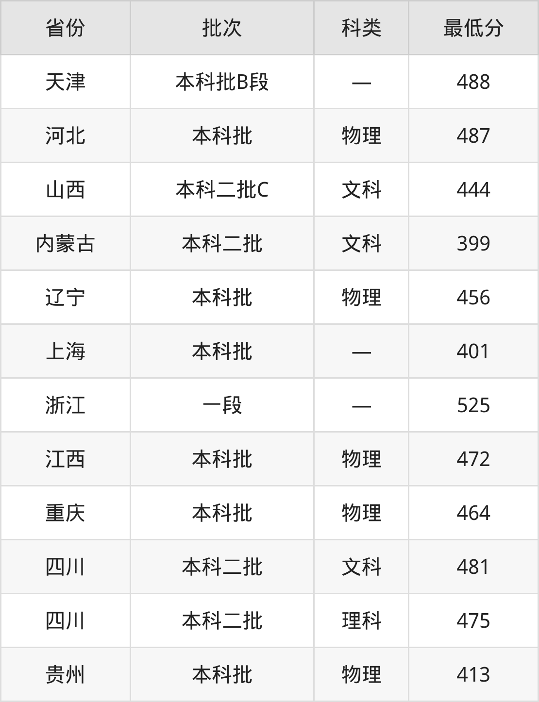 北京科技大学天津学院金融工程专业录取分数线从399分到525分不等,在部分地区的最低分数线如下: