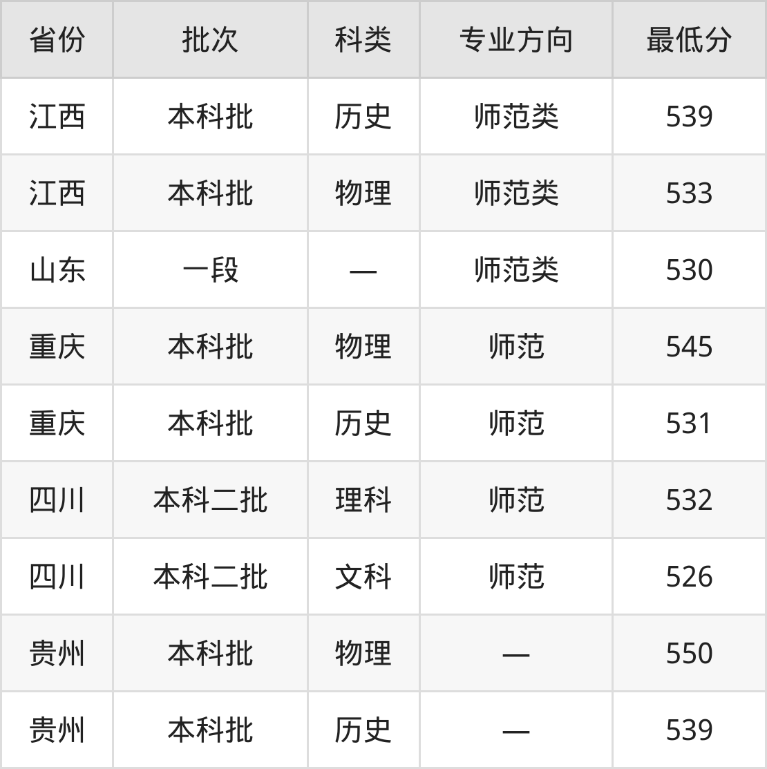成都师范学院英语专业录取分数线从526分到550分不等,最低分数线如下: