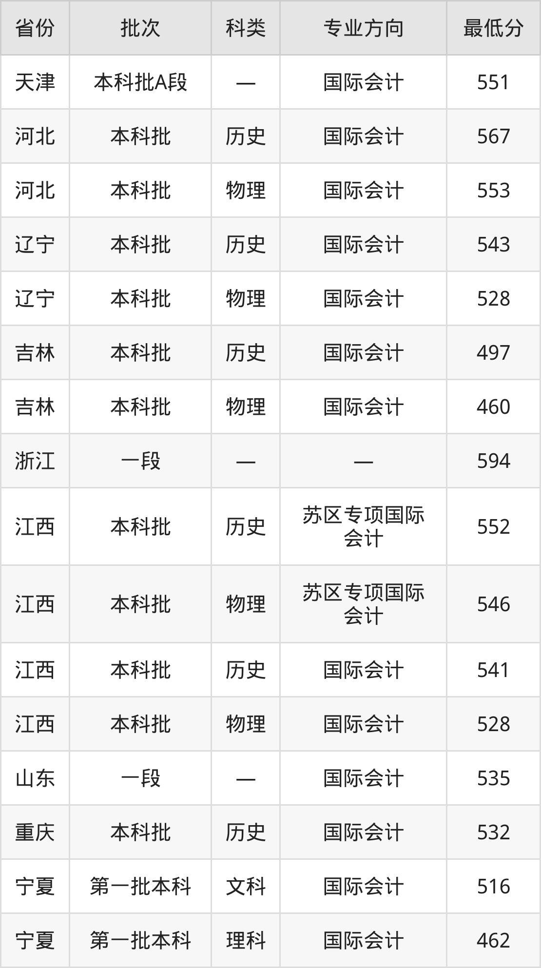江西科技师范大学会计学专业录取分数线从460分到594分不等,最低分数线如下: