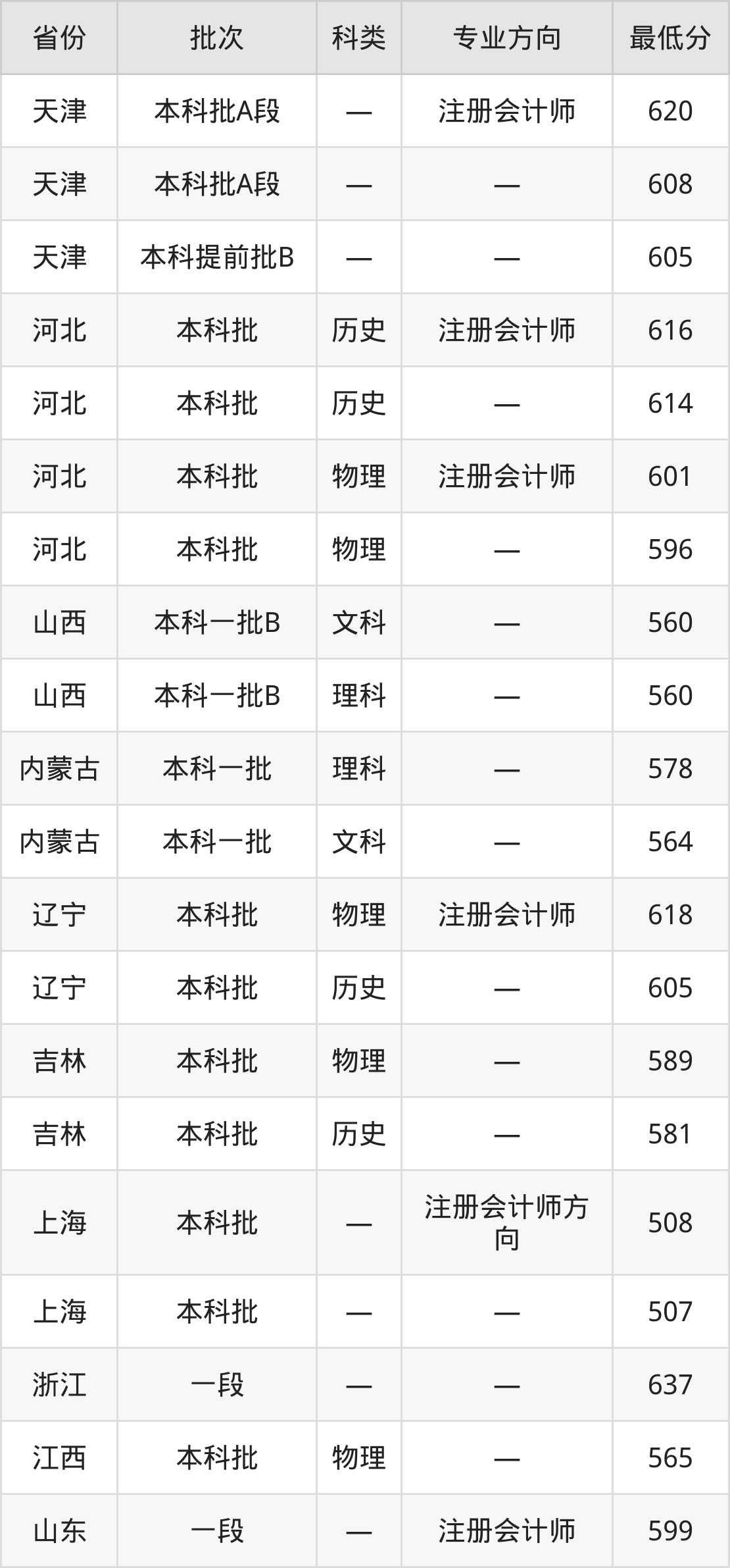 天津财经大学会计学专业在全国各省录取分数线: