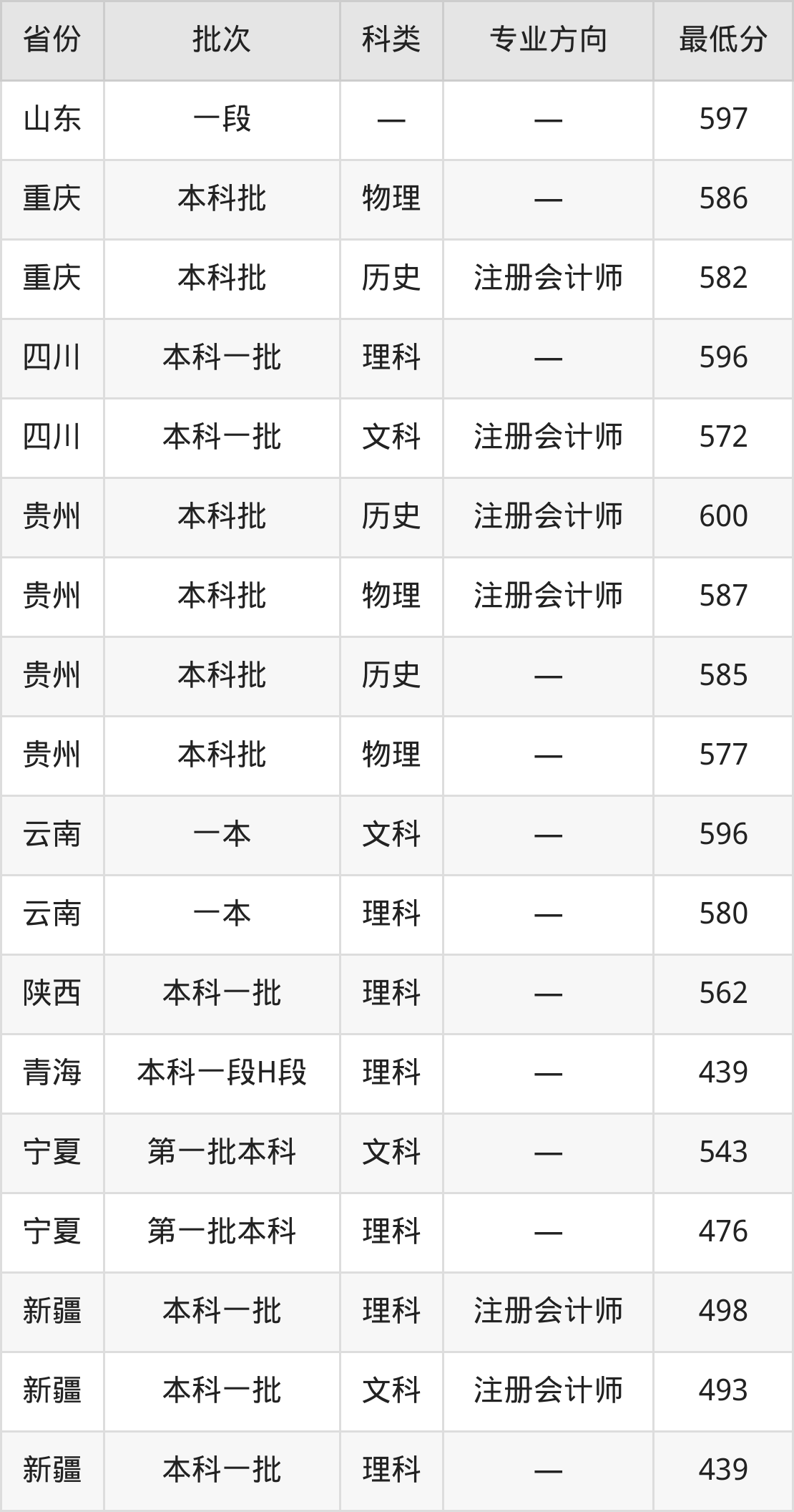 天津财经大学会计学专业录取分数线从439分到638分不等,在部分地区的最低分数线如下: