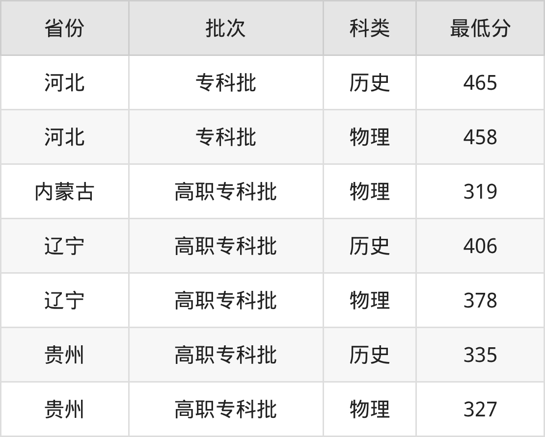 辽宁经济职业技术学院机电一体化技术专业在全国各省最低录取分数线为319分(内蒙古物理类),除此之外,在其余地区的最低分为河北物理类458分、辽宁物理类378分、贵州物理类327分,以上数据均为2025年数据,供2026年高考生参考。
