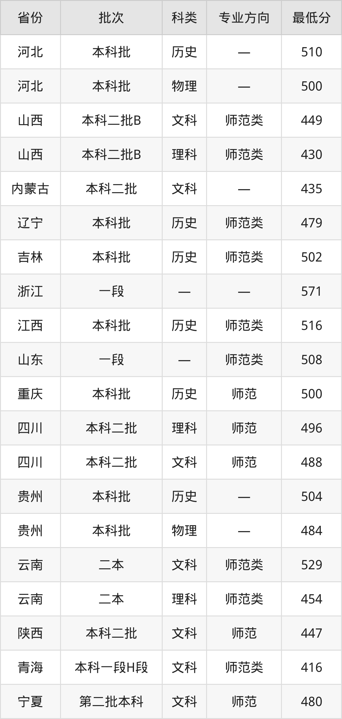 琼台师范学院英语专业录取分数线从416分到571分不等,在部分地区的最低分数线如下: