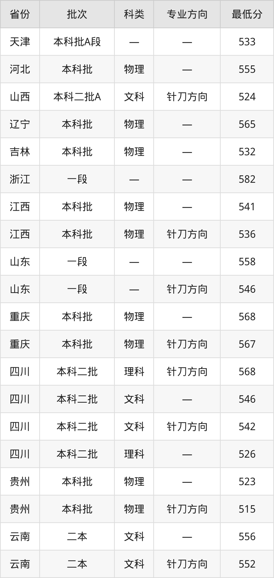 湖北中医药大学针灸推拿学专业在全国各省最低录取分数线为515分(贵州物理类),除此之外,在其余地区的最低分为山西文科524分、浙江582分、江西物理类536分、四川理科526分等,以上数据均为2024年数据,供2025年高考生参考。