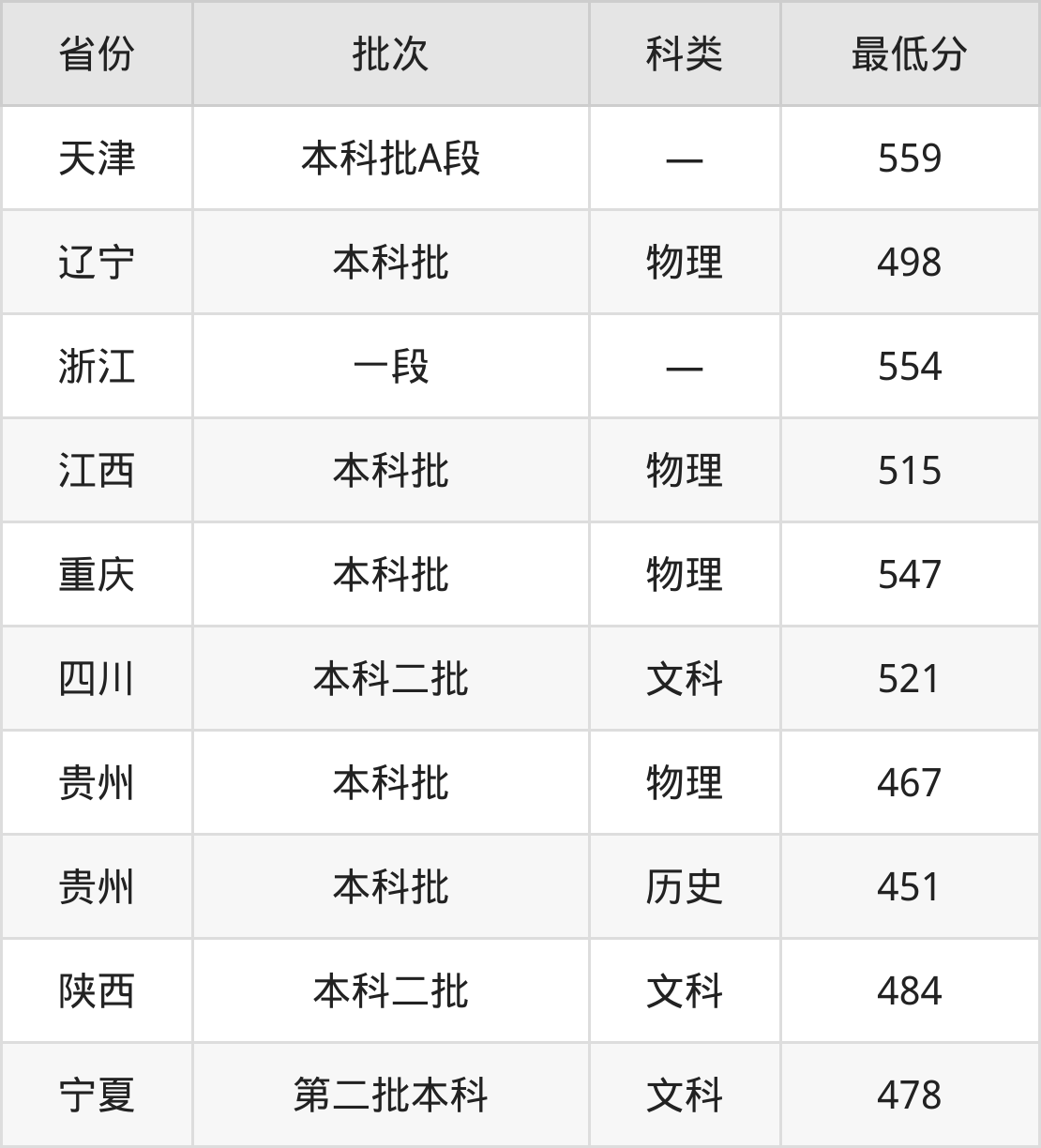 贵州医科大学护理学专业在全国各省最低录取分数线为451分(贵州历史类),除此之外,在其余地区的最低分为四川文科521分、宁夏文科478分、天津559分、辽宁物理类498分等,以上数据均为2024年数据,供2025年高考生参考。