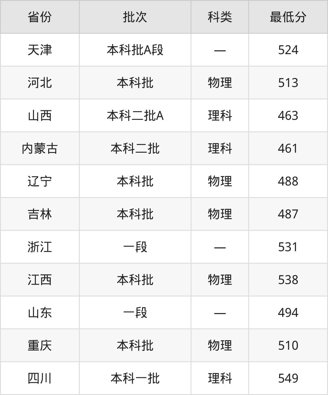 河南工业大学饲料工程专业录取分数线从461分到549分不等,在部分地区的最低分数线如下: