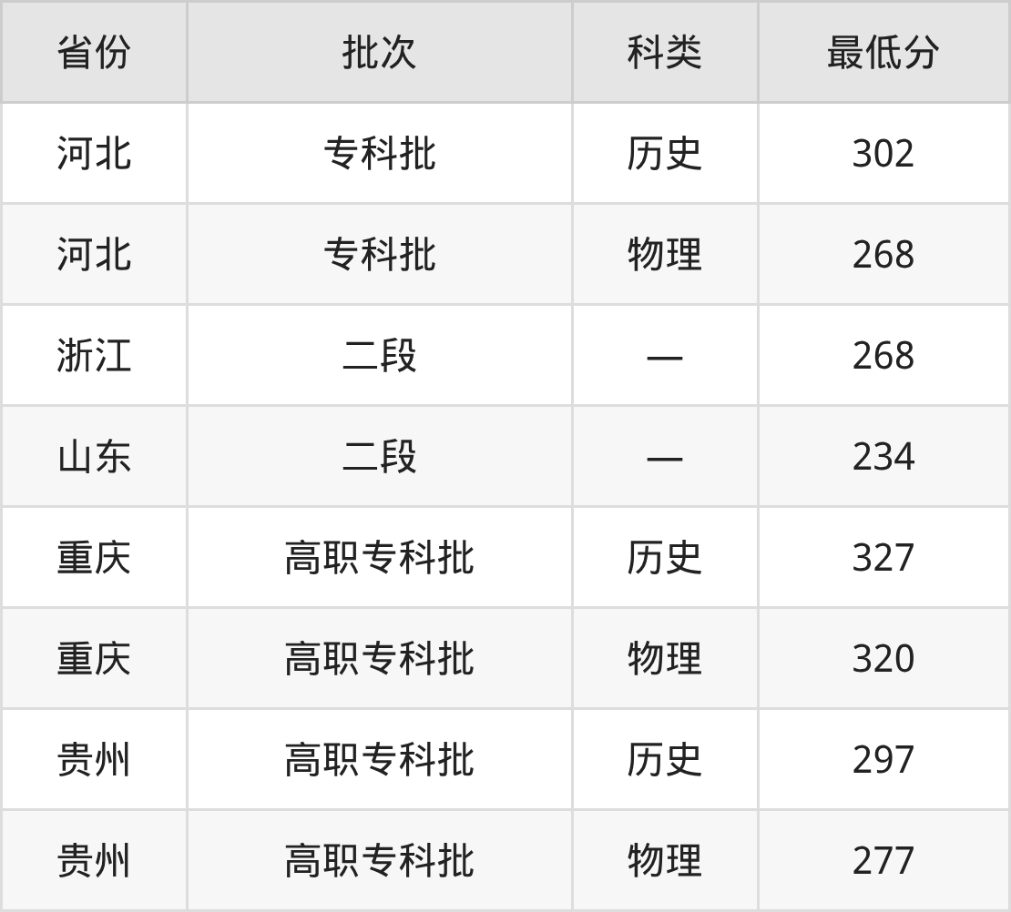 贵州铜仁数据职业学院大数据与会计专业录取分数线从234分到327分不等,最低分数线如下:
