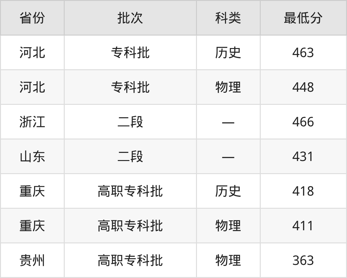 九江职业大学人工智能技术应用专业在全国各省最低录取分数线为363分(贵州物理类),除此之外,在其余地区的最低分为河北物理类448分、浙江466分、山东431分、重庆物理类411分,以上数据均为2025年数据,供2026年高考生参考。